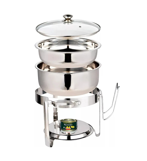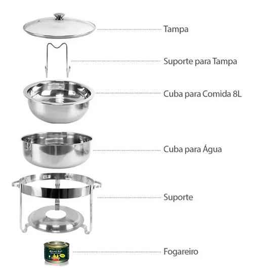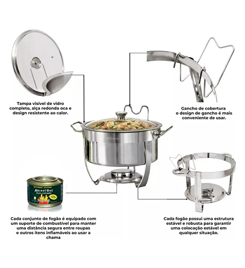 Seguindo o mesmo padão do retangular, o redondo so muda seu formato, matendo o banho maria, cuba do alimento e fogareiro.